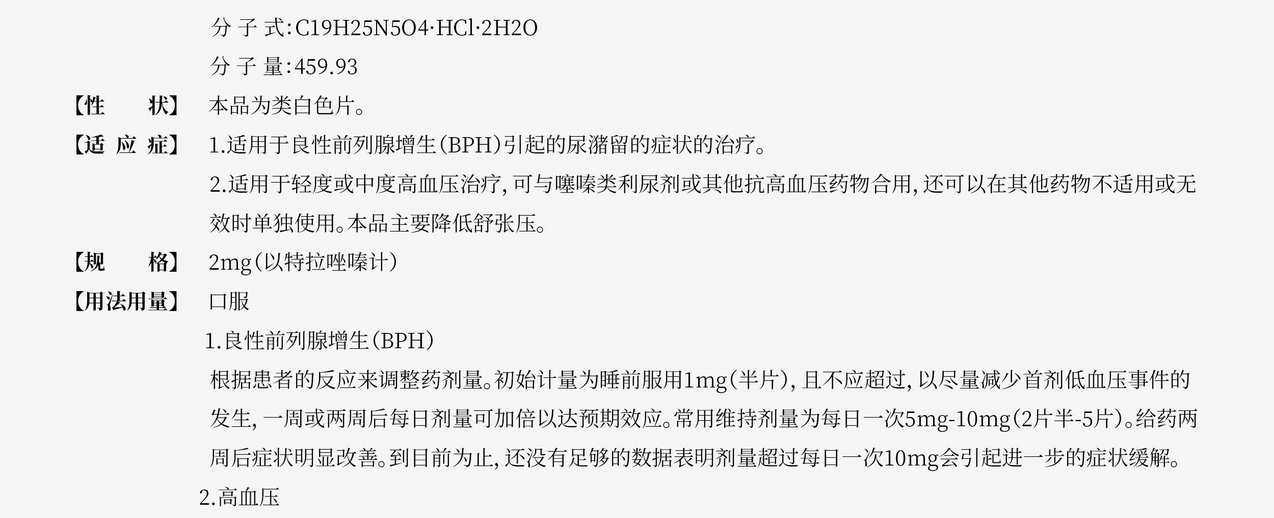 【成 份】 主要成分:盐酸特拉唑嗪。详情见以下说明书。